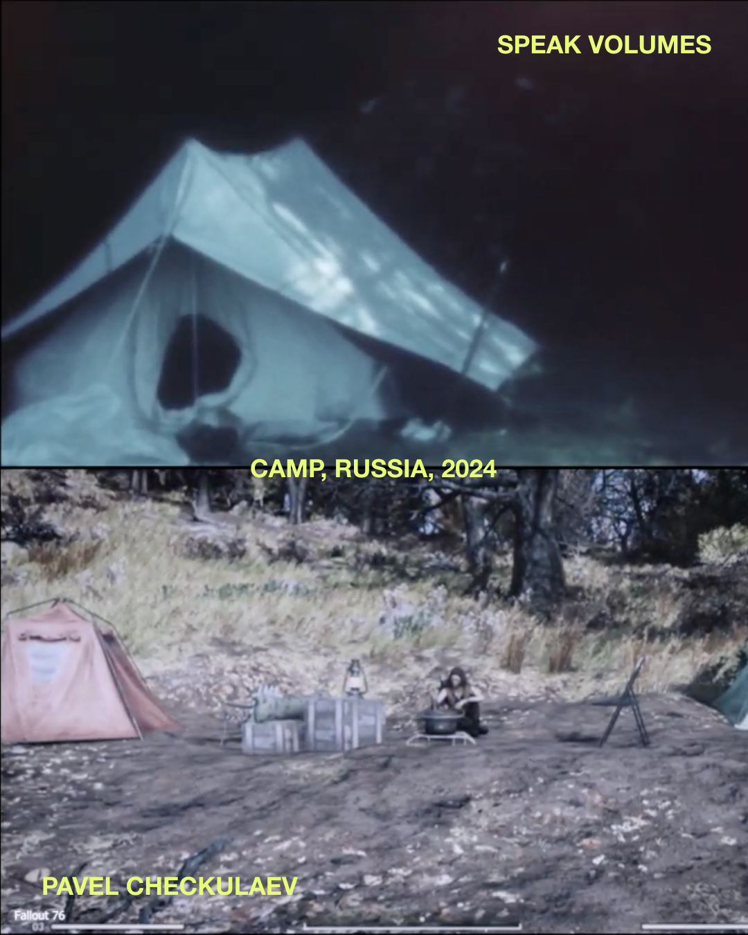 Other works shift toward what Gilles Deleuze called the any-space-whatever: spaces without function and full of time, where cinema captures durations rather than events. In "WAIT FOR ME IN OBLIVION" (Sergei Prokofiev — Denmark/France, 2024, 10’48’’), fragile sheets of graphite combust into traces that drift between persistence and disappearance. "The House That Slowly Collapses" (Alisa Kutsenko — UK, 2025, 10’40’’) undoes the linearity of history, proposing cyclical models in which past, present, and future coexist and overlap. "CAMP" (Pavel Checkulaev — Russia, 2024, 11’27’’) begins from the artist’s family tradition of camping, passed down from his grandparents, and translates it into the solitude of virtual terrains. In these digital campsites, the persistence of memory is less about geography than about the desire to keep intimate rituals alive, even in transformed, immaterial form.