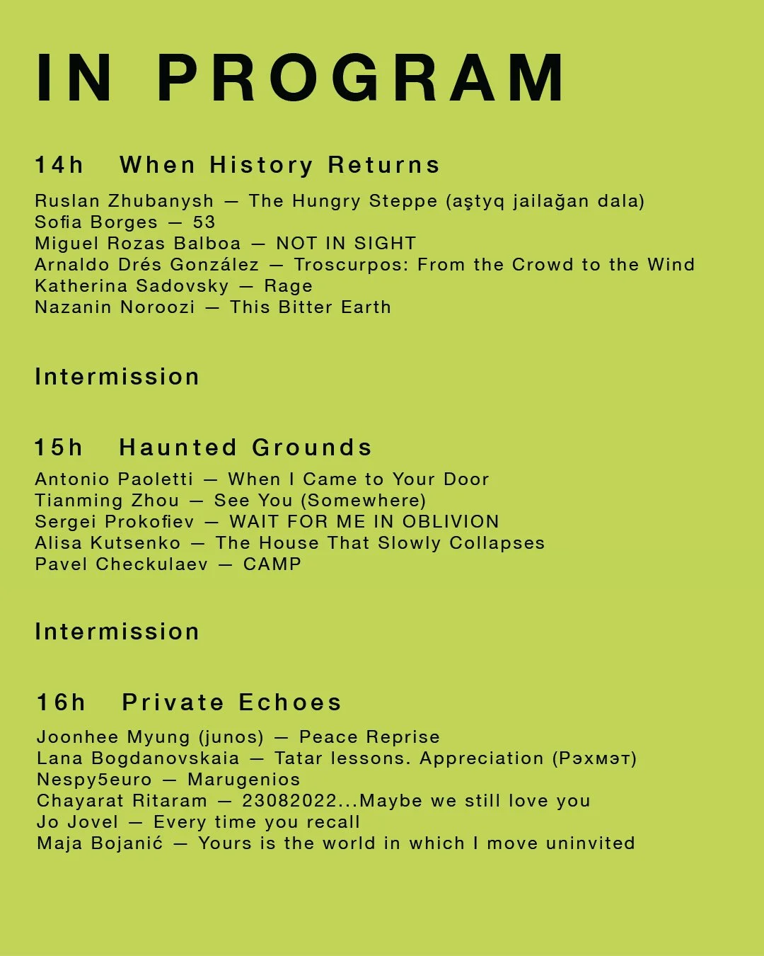 The films of this section offer distinct and varied gestures that form a panorama of cinematic practices unsettled by the question of history and its persistence. From this encounter emerge images that unfold freely, just as "Rage" (Katherina Sadovsky — Russia — 2023) departs from the too vertical and too imposing Soviet architecture to favour detour and circumvolution over any desire to delimit. This dynamic echoes Jacques Derrida, who writes that where the trace is deficient, it must be supplemented by an image, a commentary, a narrative. Cinema, says Derrida, does not replace other memory devices; it mythologises. In doing so, it allows the erased trace to re-enter the present through the screen.