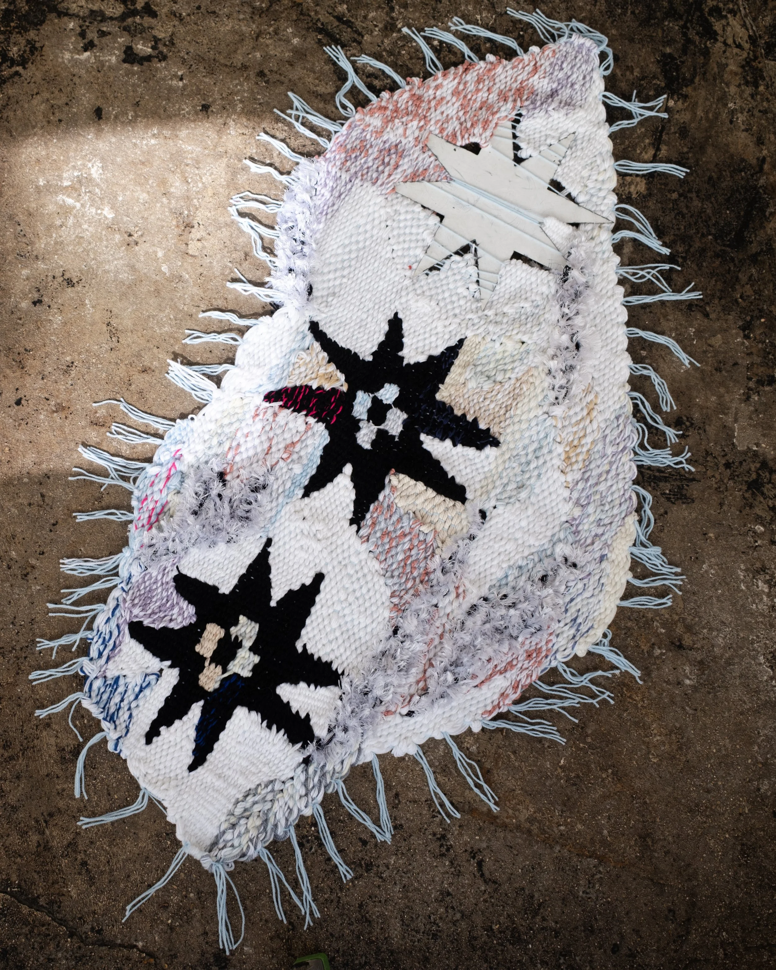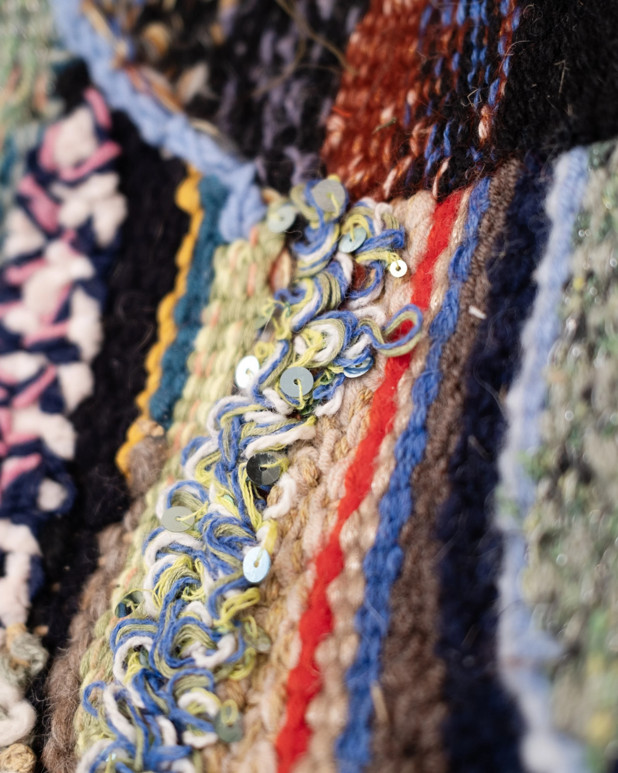 Ecology is integral to Demina’s practice. The history of weaving mirrors the history of loss: once sacred and slow, it was consumed by industrialization, stripped of ritual, and transformed into a source of planetary waste. Against this tide of speed and excess, she reclaims the patience of the hand, working with discarded fabrics, family remnants, and recycled fibers. Her materials are threads that have already lived, transformed into forms that speak of endurance and renewal.